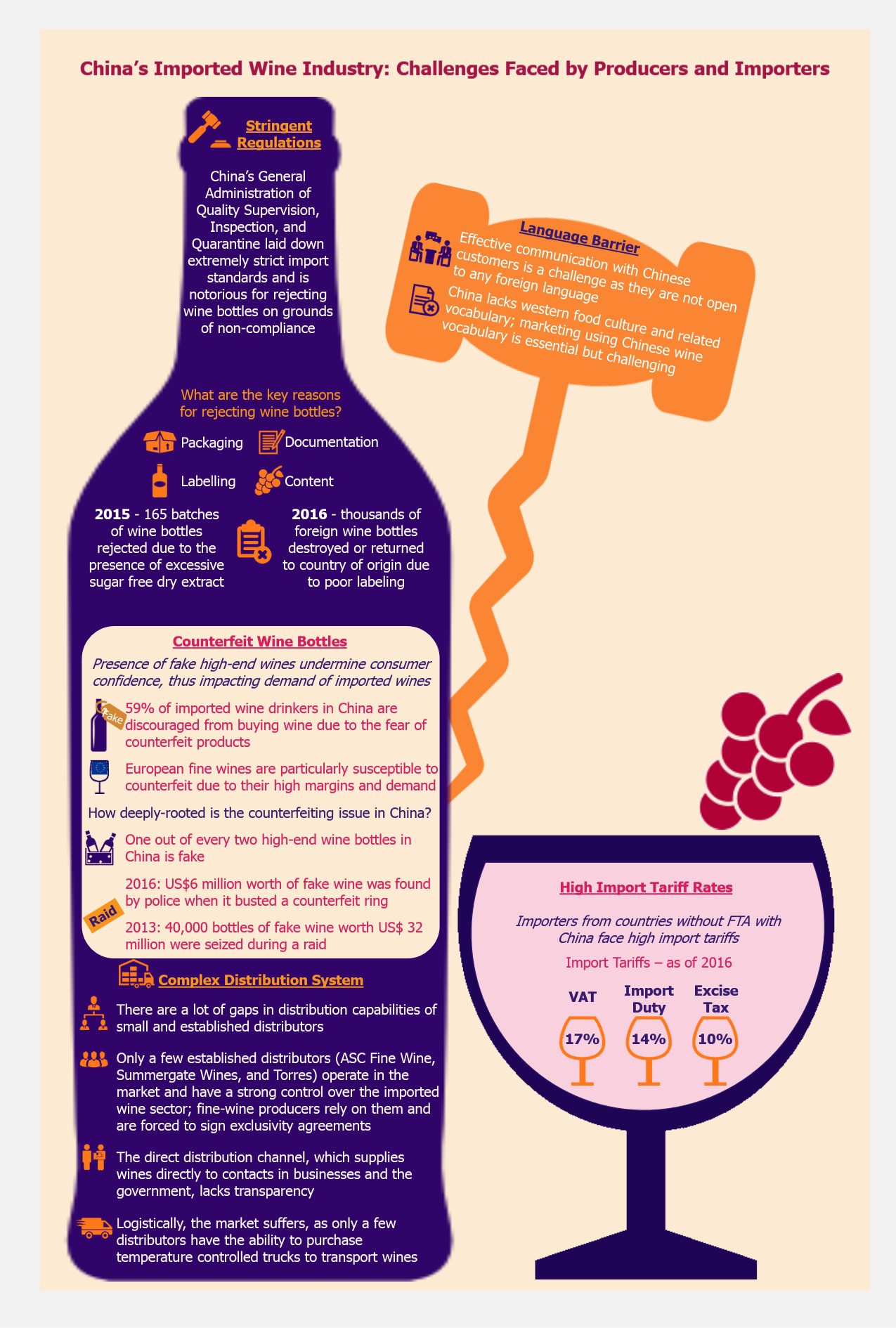 Despite the growing wine demand, the imported wine industry faces several challenges including dealing with high import tariff rates and circulation of fake wine, breaking through the language and cultural barrier in China, and facing the complex distribution system along with strict import regulations.