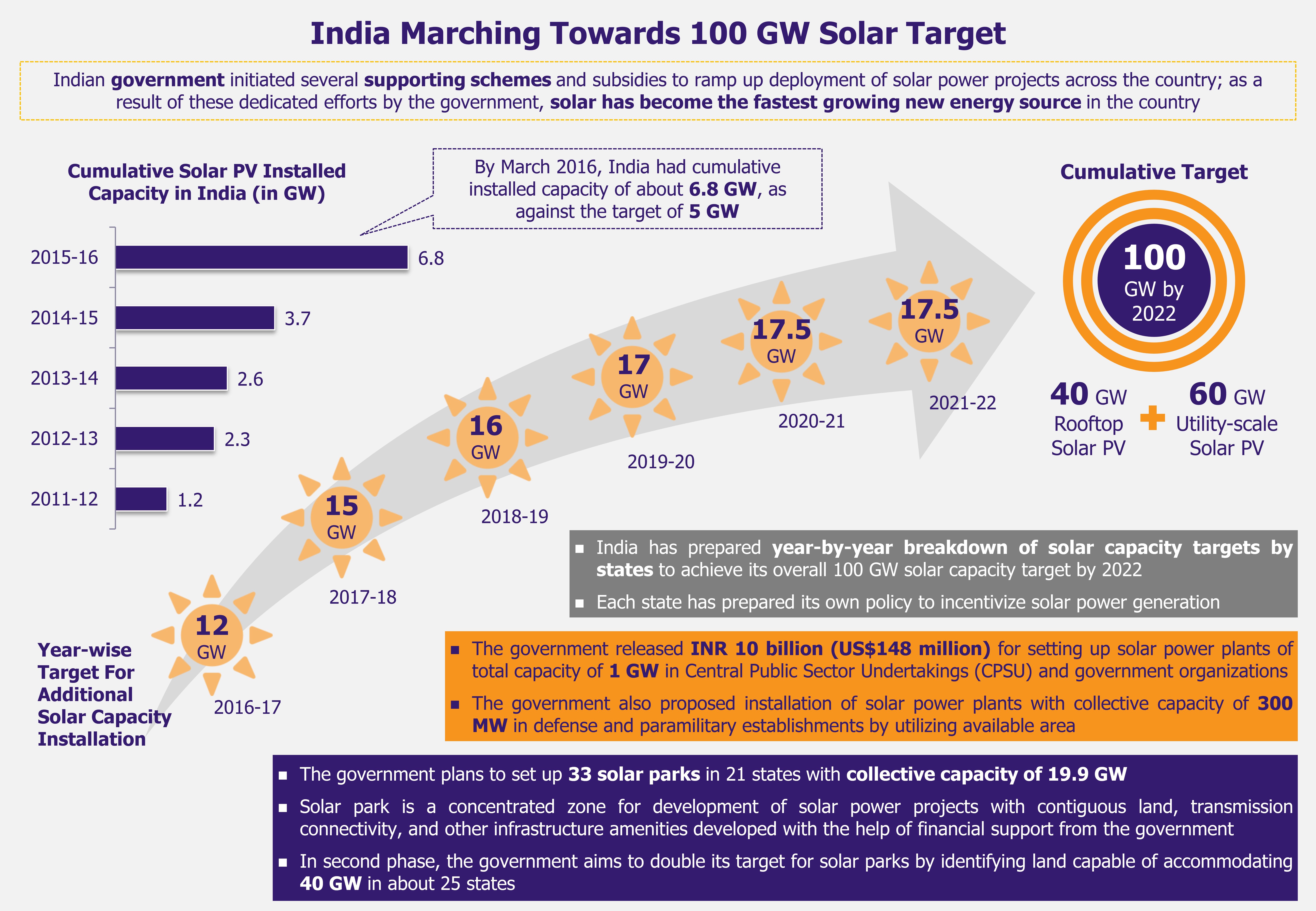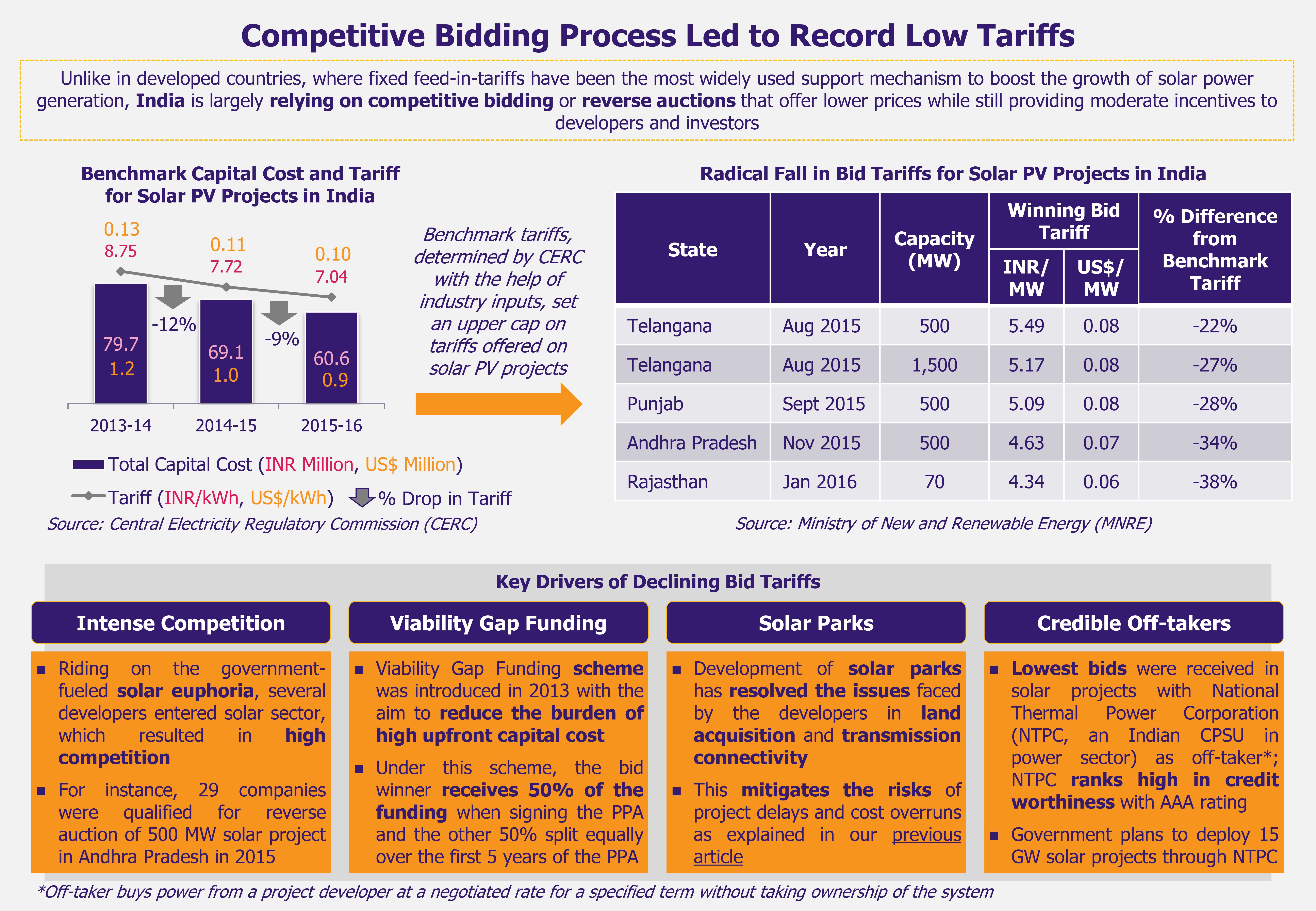 India is seen as an upcoming solar energy investment hotspot after its announcement of an ambitious target to install 100 GW of solar power capacity by 2022, which we wrote about in our article “Solarizing India – Fad or Future?” in July 2015. However, in view of record low tariffs following the competitive bidding, investors have begun to raise concerns over the viability of such solar projects and doubt to earn desired returns on their investment.