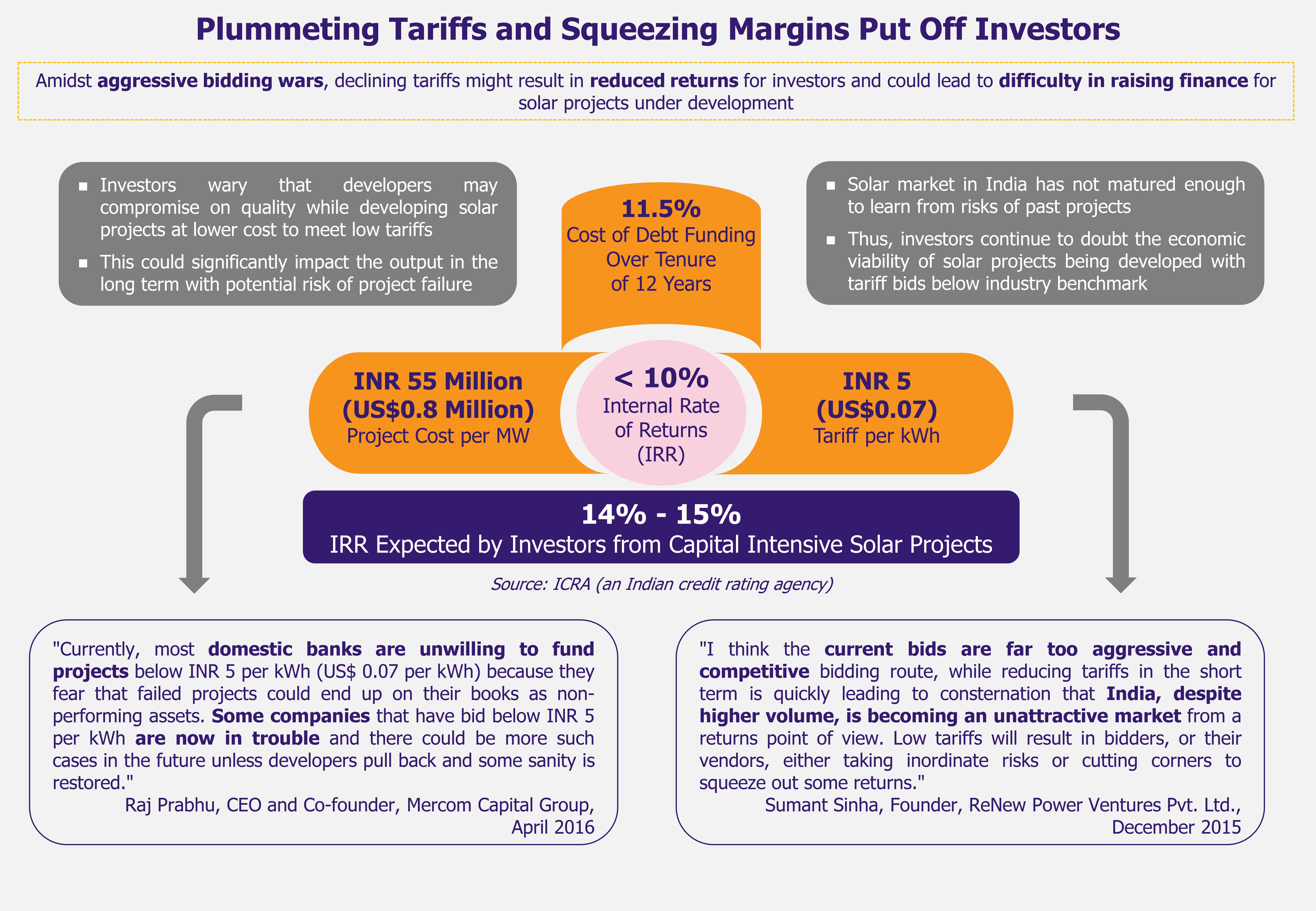 Indian government has been strongly in favor of competitive bidding or reverse auctions in order to bring down the cost of solar power. Though the solar power costs have significantly declined, aggressive bidding wars have resulted in irrational competition and unsustainable business models. Amidst concerns over viability of solar projects with such low tariffs, investors have become extremely cautious and suspect solar might be a risky investment. Developers may soon find themselves in financial constraints if the investors’ confidence continues to wane.