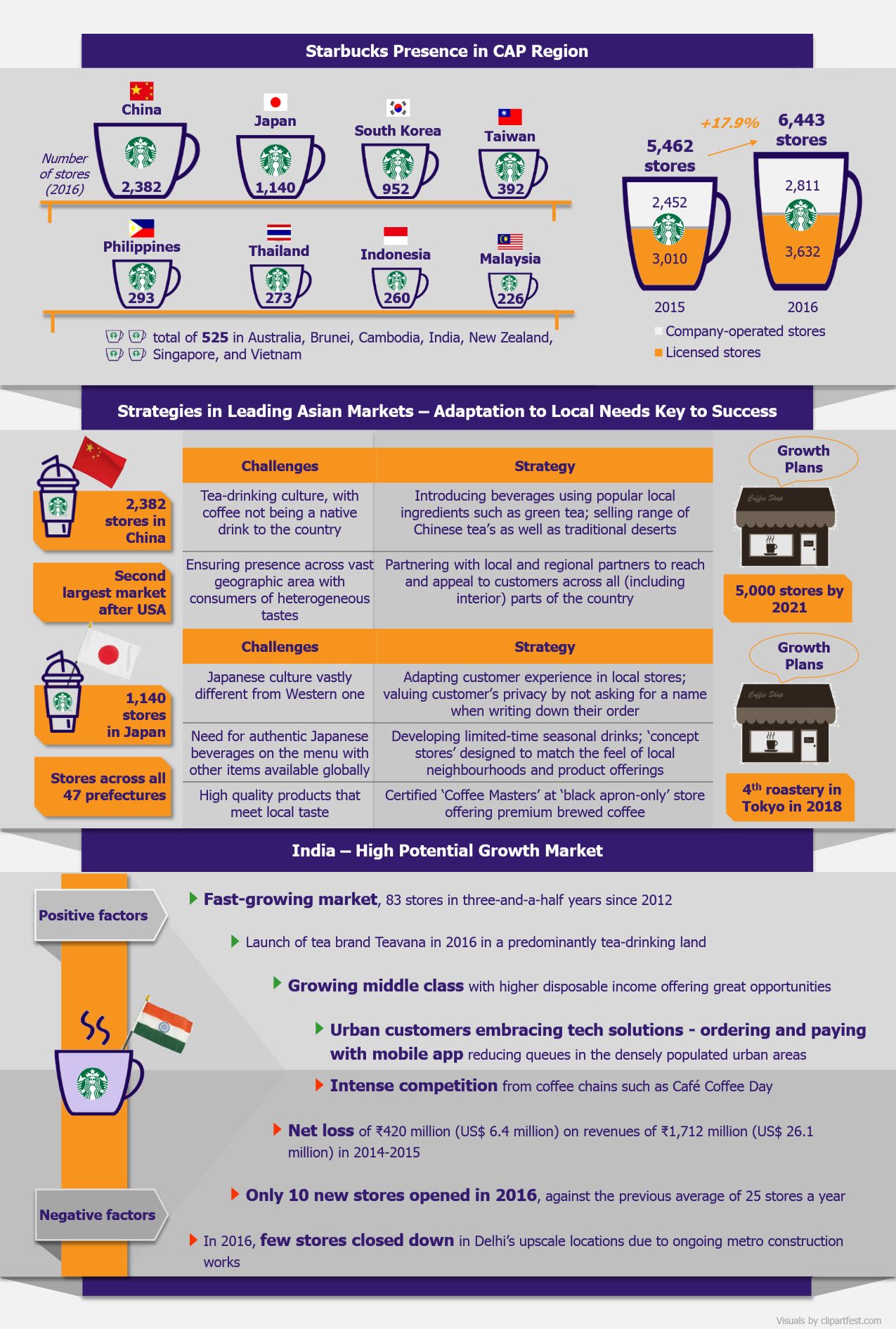 With plans to open 12,000 new outlets globally over a span of five years, out of which nearly half are to be opened in the USA and China, Starbucks is planning to take its chain to a total of about 37,000 outlets globally. Asia is increasingly important to Starbucks’ growth strategy. As of 2016, the company operated 6,443 stores in 15 countries in the China/Asia Pacific (CAP) region that includes Australia, Brunei, Cambodia, China, India, Indonesia, Japan, Malaysia, New Zealand, Philippines, Singapore, South Korea, Taiwan, Thailand, and Vietnam. Potential for growth in this region is great, not only measured in the number of stores, but also in per store revenue – the CAP region currently accounts for 25.7% of Starbucks stores count, but generates around 14% of the company’s revenue.