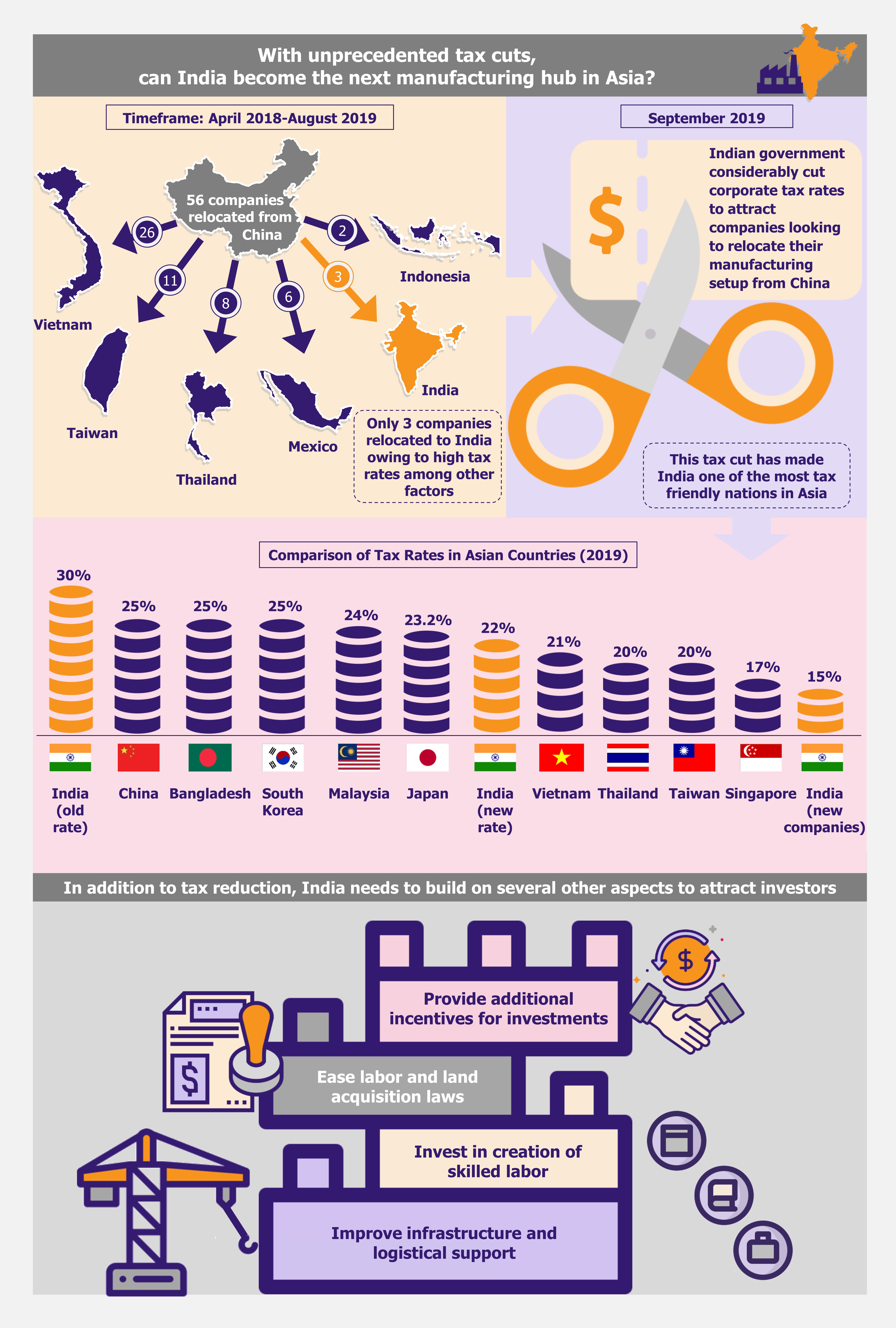 India has recently announced an unprecedented reduction in its corporate tax rates. Not only is this a respite for domestic and existing foreign companies, but it is also expected to boost India’s position as a preferred investment destination for international companies looking to diversify their manufacturing footprint. Amidst the ongoing trade war between China and the USA, many companies, such as Apple, are looking to relocate a chunk of their manufacturing facilities away from China as part of a de-risk strategy. This presents the perfect opportunity for India to swoop in and encourage manufacturers to set base there instead of other Asian countries. However, tax reduction alone may not be enough to score these investments as the government needs to provide additional incentives apart from improving logistics and infrastructure, as well as land and labor laws in the country.