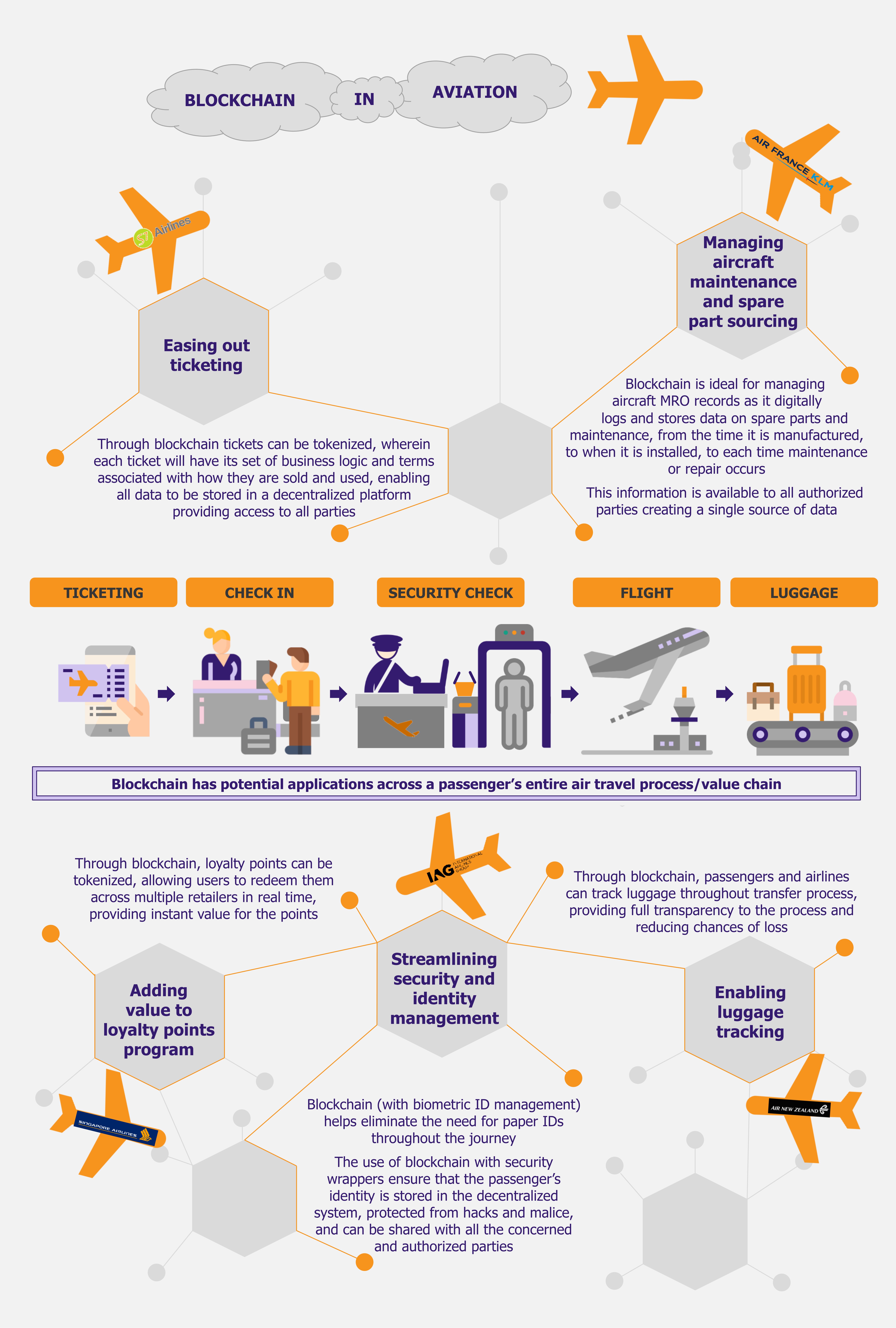 Blockchain technology has captured the interest of several industries and aviation is no exception. Its decentralized, secure, and immutable nature makes blockchain technology ideal for many operational aspects and verticals within the aviation industry. In fact, most of the blockchain-based solutions in the aviation sector extend beyond basic financial transactions and range across security and identity management, ticketing, maintenance, baggage management, and loyalty programs. Various stakeholders in the aviation industry, including airlines, airports, aircraft manufacturers and maintenance providers, and airspace technology providers, etc., are partnering together to explore and develop blockchain-based capabilities across the industry’s value chain.
