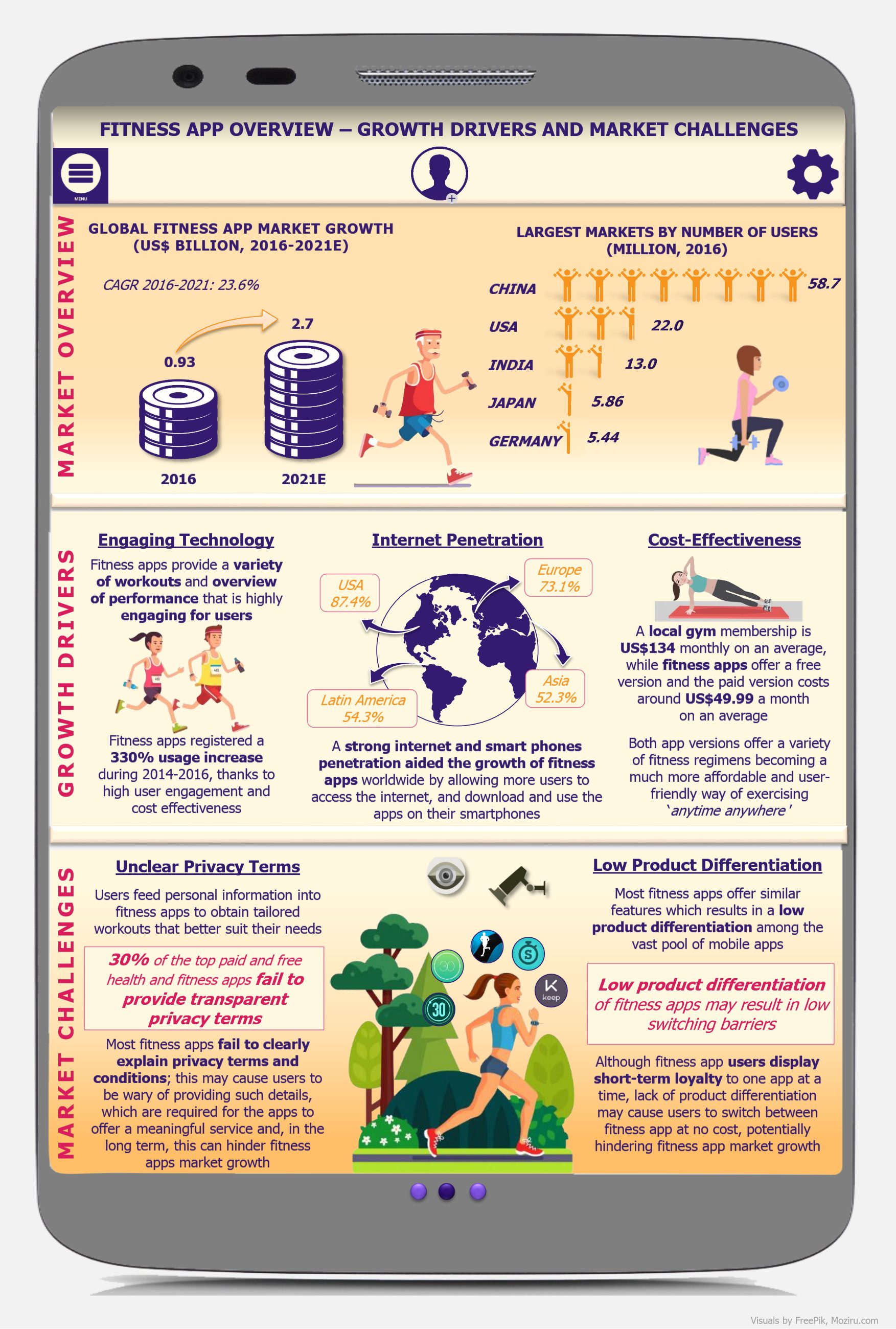 Global fitness app market was worth US$930 million in 2016, expected to grow at a CAGR of 23.6% during 2016-2021 to reach US$2.7 billion. This growth can be attributed to drivers such as steady increase in smartphone adoption, affordable costs of mobile apps, as well as growing health awareness among consumers, including smartphone users. Regardless of how steady growth the market is registering, its expansion may hit a roadblock due to low product differentiation in a fiercely competitive market and unclear privacy policies that may cause wariness among consumers.